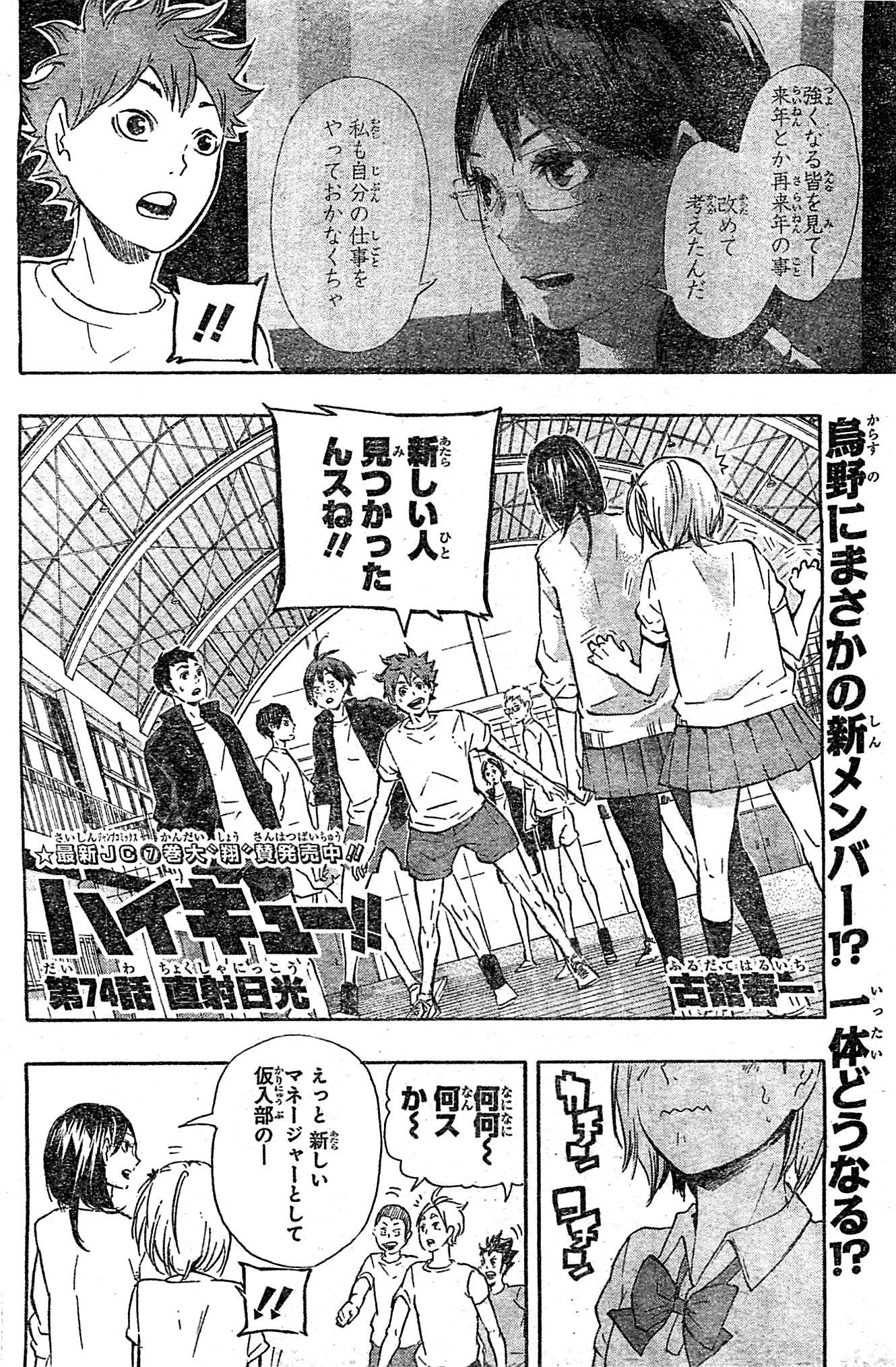 Po lekcjach Kiyoko zaprowadza Hitokę, by przedstawić członkom klubu dziewczynę, która ma być tymczasowym menadżerem. Yachi przedstawia się wszystkim, a chłopacy są podekscytowani i od razu chcą ją poznać. Podchodząc do niej po kolei Asahi przeraża dziewczynę swoim wyglądam, dlatego Daichi każe mu się odsunąć. Podobnie postępuje Kōshi z Ryū i Yū, którzy zza jego pleców zbytnio przyglądali się nowej menadżerce. Azumane stwierdza, iż to wspaniale, że mają nową menadżer, która zajmie się nimi pozostałymi w przyszłym roku. Shimizu próbuje wyjaśnić, że dziewczyna jest tymczasowo i ma również inne obowiązki. Hitoka nieśmiało oddaje się pod opiekę klubowiczów, a w odpowiedzi otrzymuje głośne powitanie.