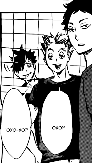 - В прошлом году, на Весеннем школьном турнире, Бокуто купил непопулярную футболку, на которой было написано: «Мудрость Аса: Во-первых, образ аса должен вдохновлять своих союзников. Во-вторых, ас — это тот, кто может обрушить любую стену. В-третьих, ас должен ударить любой мяч так сильно, как только он может.» Неудивительно, что Бокуто и Хината считают это крутым.