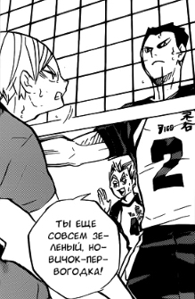 Лев ободряет Шибаяму, говоря, что он играет вместе с ним, а потому Шибаяма может не волноваться; Кенма подмечает, что у Льва большое эго. Также. позже он говорит Шибаяме меняться на задней линии только со Львом.