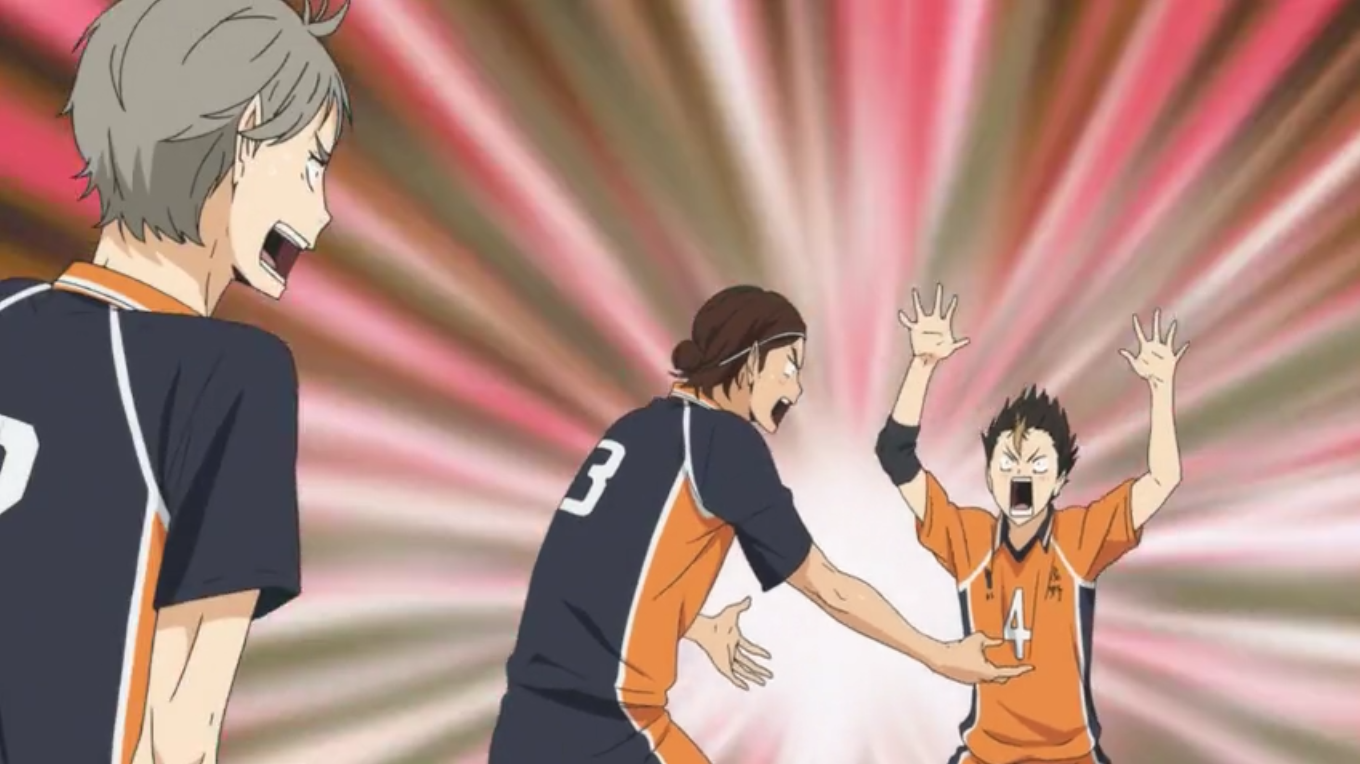 When Karasuno watches their match recap on television, Asahi starts to feel underwhelmed once he sees that his plays won't be on the highlights. Shortly after, his concentrating expression is teased by Nishinoya. Sometime later, he comments on Tanaka's surprisingly thoughtful plays during the match when alone with Sugawara and Daichi.