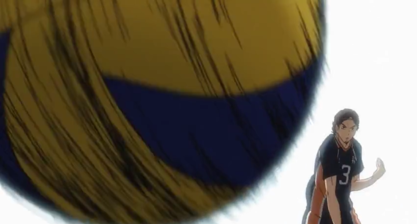 The last half of the second set starts to put pressure on Asahi when the Date Tech blockers are able to start blocking him more. Asahi is still determined not to let the Iron Wall break him again. Near the end of the set, Aone beats Asahi in a joust at the net but because Nishinoya was able to save the ball with his foot and give Karasuno another chance to attack, Asahi is able to make his spike count and win the match for Karasuno.