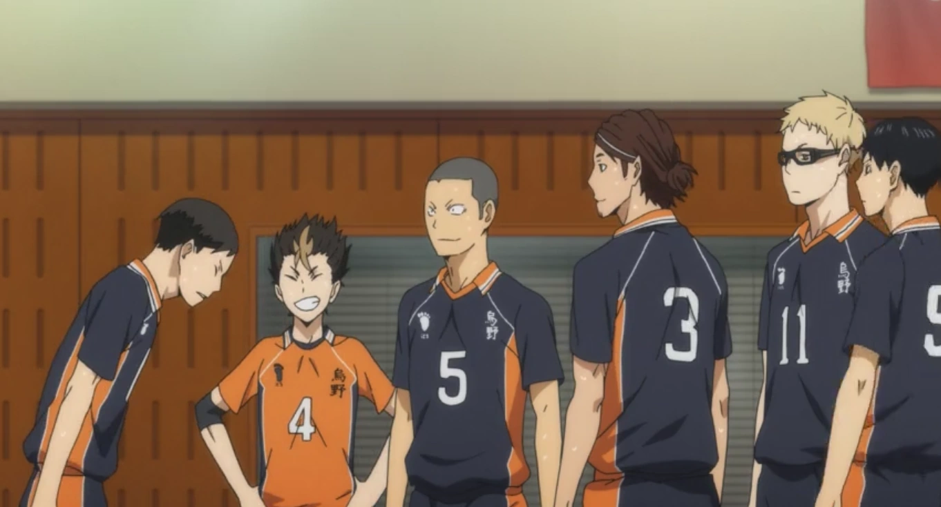 Shortly after, Karasuno watches Nekoma's match against Kiyokawa where Asahi starts to sympathize with their ace as he fails to score. Noticing this, Sugawara discourages him to do so.