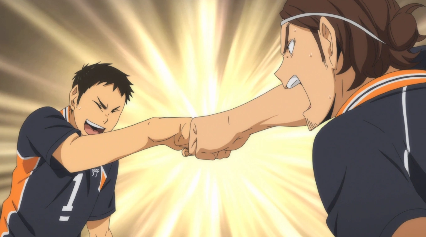 During the end of the third set, Asahi checks up on Nishinoya after he fails to receive Ushijima. Despite Nishinoya being frustrated over this, Asahi stills remarks that he's gotten better at digging Ushijima's spikes in such a short time. Asahi and Nishinoya then high five when Asahi easily scores past Shiratorizawa. Shortly after, Asahi remarks that Tsukishima is developing into the team's blocking leader as before this, he had led him and Asahi into Ushijima spiking in Nishinoya's direction. Later on, Kageyama sets to Asahi while having choices for hitters during Karasuno's attack. Taichi, who is the rotation's middle blocker, is anxious about the incoming attack but is able to block Asahi nevertheless. Asahi would serve sometime later and Goshiki roughly bumps it.