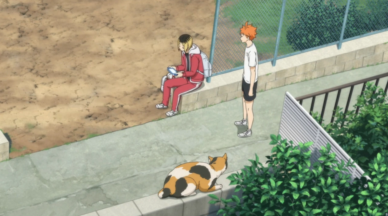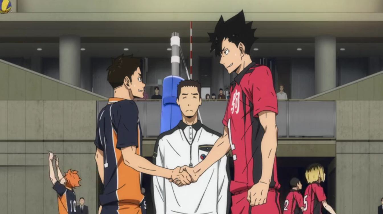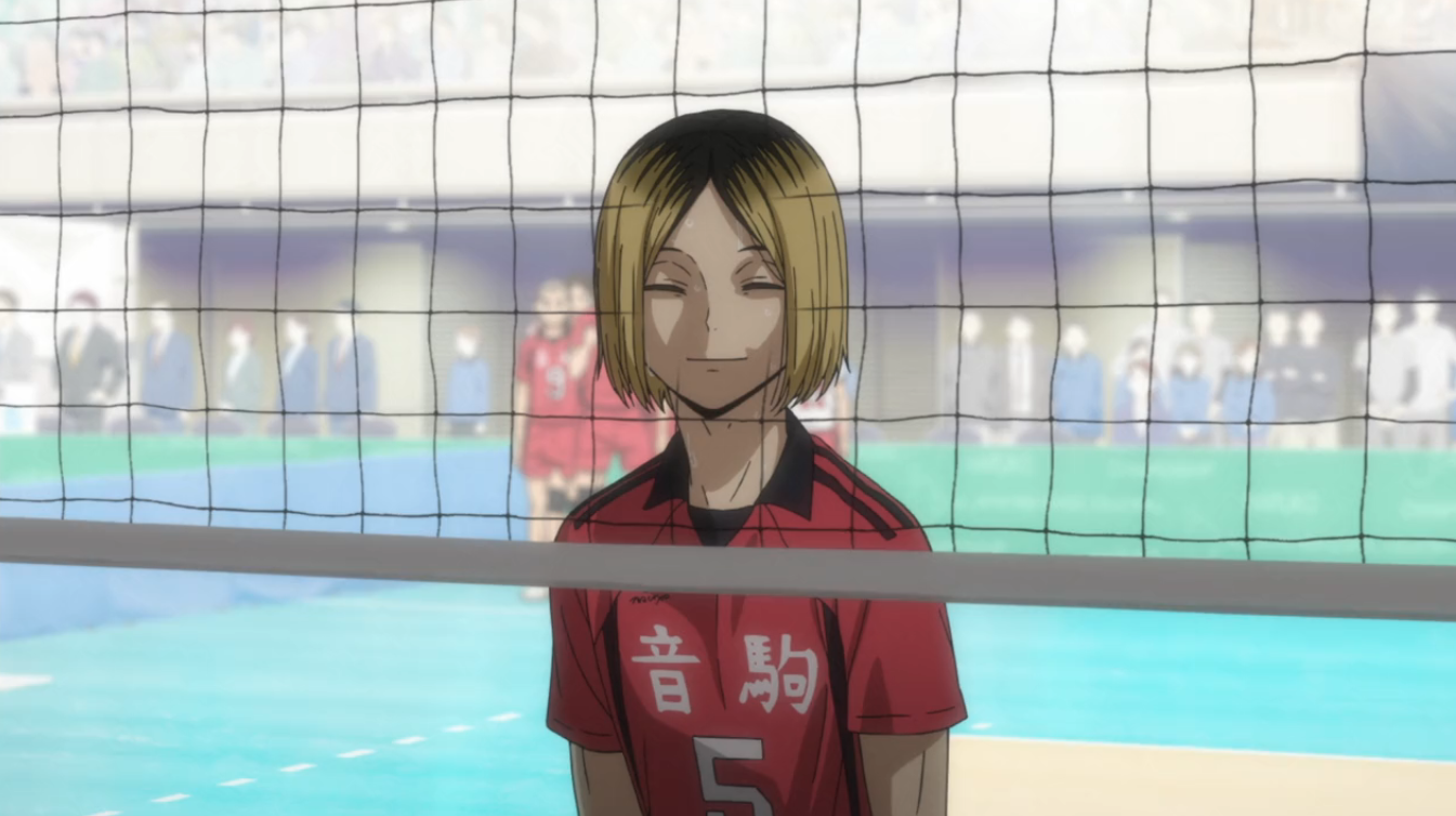 As the teams switch sides, a continued flashback of the opening flashback shows Kuroo finding Kenma talking to Hinata. As he approaches, he hears Kenma mention how Nekoma has lost some of their glory but admits that he thinks the current generation is amazing. This surprises Kuroo and he calls out to Kenma right as Hinata is asking what team Kenma is part of. Kenma bids Hinata farewell but mentions how they will see each other soon. As they walk away, Kuroo mentions how rare it is for Kenma to speak to strangers given how he barely talks to people he already knows.