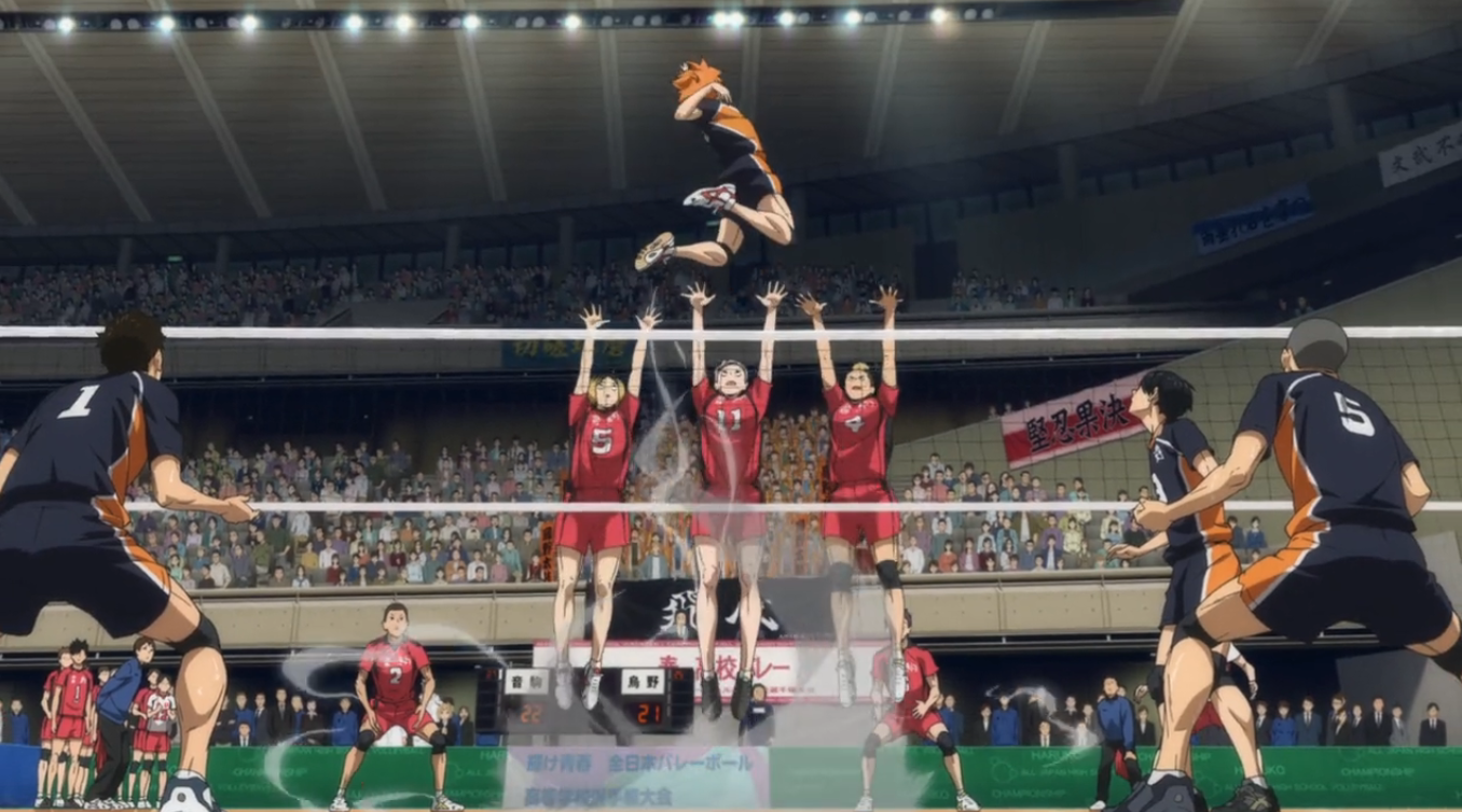 As the next few rallies play out, each side remembers different points when they faced their fated rival and the bonds they've made along the way. At Kuroo's next serve, Asahi tries to spike, but Lev directs his spike to go right to Kuroo. However, Karasuno would get the point in the end when Tsukishima gets his spike past Lev and Kuroo narrowly misses making a receive.
