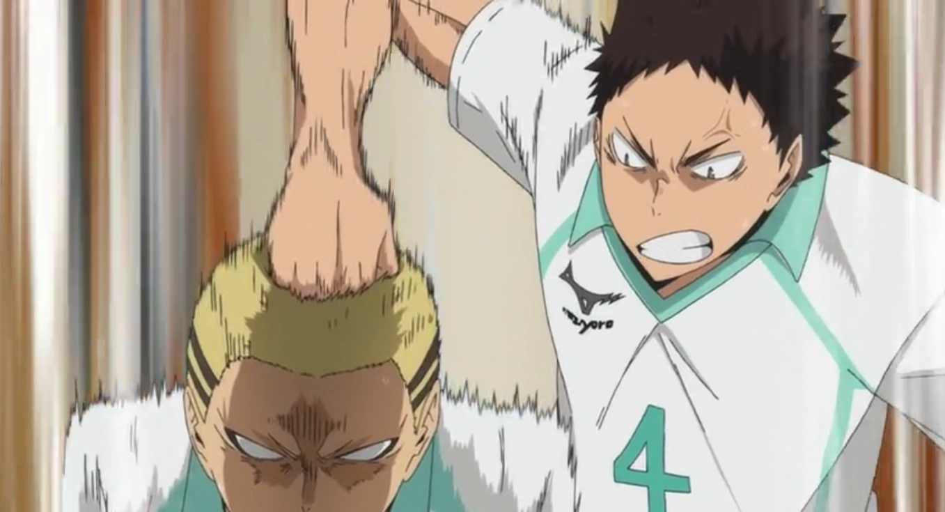 Iwaizumi then punches Kyōtani on his head while yelling at how reckless he was. Kyōtani explains his behavior as simply being overly excited to be back in a game after not having been part of one for a while. Just before the second set starts, Oikawa tells Kyōtani that he is free to play as he wants but will not hesitate to have him removed if he causes problems. Kyōtani does not appear to take his warning seriously until Iwaizumi warns him of the same thing and he states that he understands, much to Oikawa's annoyance. On the sideline, Yahaba would explain that Kyōtani is only listening to Iwaizumi because he had previously challenged the ace player to numerous sports competitions only to be beaten every single time.[4]