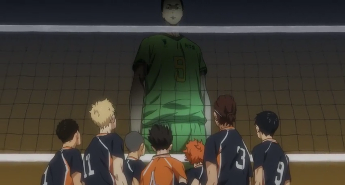 While waiting for their next match, several of the Karasuno players watch the current game and many are overwhelmed at the size of the tallest player on the team and watch as he is able to land the winning point with no problem. While Daichi tries to encourage the team, Yachi reflects how a single loss will mean the end for the team. At that moment, Yūdai Hyakuzawa of the Kakugawa High Volleyball team walks past them and his height of 6'7" terrifies Yachi and Hinata.