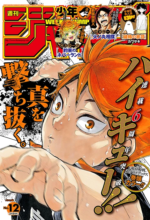 - In commemoration of the sixth year anniversary of the manga's serialization, the magazine cover shows Hinata preparing to spike a ball. The text reads: "Shoot for the truth."