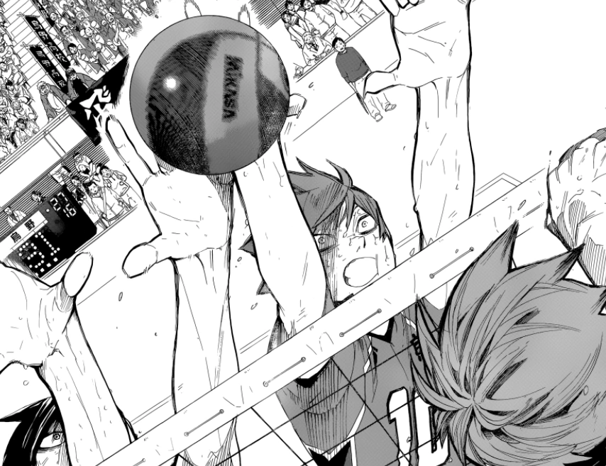 Following Hinata's last pass, Karasuno is ready to challenge Inarizaki head on with a synchronized attack. Kageyama gives the last toss to Tanaka, who attempts a super inner cross. However, Inarizaki players are all in position to either block or receive any kind of spike. Ōmimi successfully blocks Tanaka's cross, causing the ball to bounce back to Karasuno's side of the court. Kageyama tries to make a save but accidentally sends the ball flying toward the back of their own court. Tsukishima pushes himself past his limit to reach the ball, but can only watch as the ball brushes his finger and slips away. However, Daichi emerges next to Tsukishima in the nick of time and performs a spectacular flying receive.