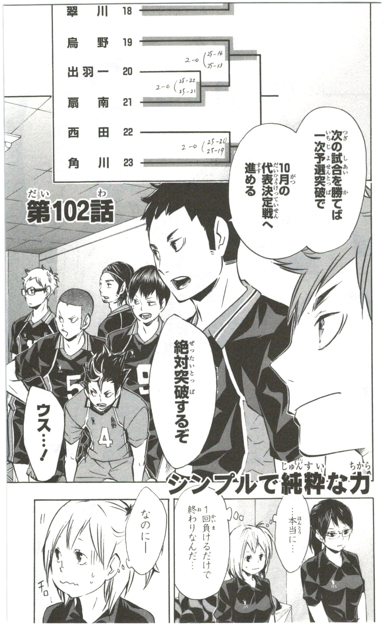 Karasuno is determined to defeat their next opponent and secure a spot to the qualifier rounds. However, some members, notably Hinata, are apprehensive about facing Hyakuzawa, a player over 2-meter tall. The first-years casually compare Hinata and Hyakuzawa's height difference to "Tikachu" and a blackbelly lantern shark. Kageyama remains nonchalant over the fuss, not understanding why Hinata is intimidated in the first place.