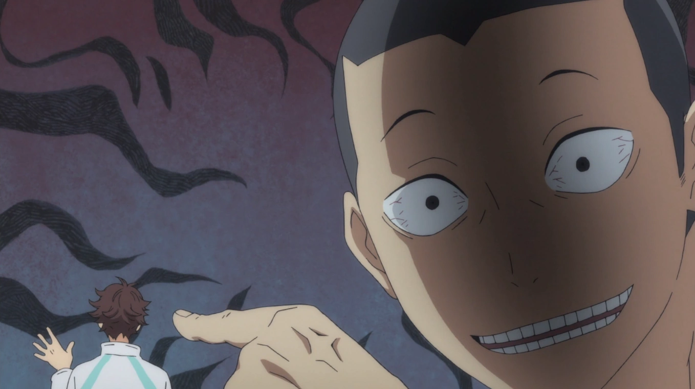 During the match, Tanaka sees how Nishinoya's continued training during his suspension has allowed the libero to make incredible saves. His astonishment extends to Asahi when he sees that the third-year ace is still as powerful as ever despite being away from the club for a month.