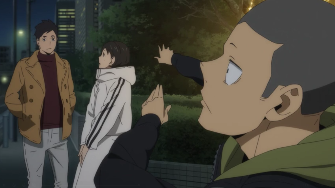 When the team returns to their hotel, Tanaka has a brief conversation with Kanoka. After she leaves, Ennoshita states that Tanaka has a chance to have a girlfriend and how he noticed her behavior toward him before the opening ceremony; leading him to believe that Kanoka has a crush on Tanaka. Tanaka becomes stunned at hearing this and realizing all the times that Kiyoko has rejected his affections. Later that night, Tanaka is outside the hotel trying to calm his nerves when Kanoka finds him. The two talk for a while but Tanaka becomes nervous when he believes that Kanoka is going to confess her feelings to him and declares that he has his heart set on another. During his statement, he didn't notice another man approach Kanoka and right away believes him to be Kanoka's boyfriend. Thinking he misunderstood the situation, Tanaka races back to his hotel in embarrassment.