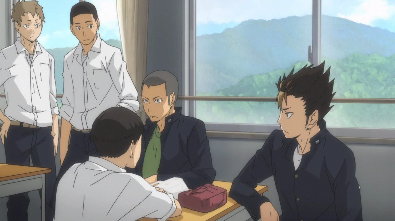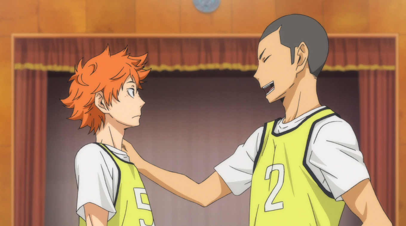When Nishinoya's suspension from the team ends and he returns to the club, Tanaka expresses his excitement at having his friend back on the team. However, he quickly becomes annoyed when Nishinoya starts talking badly about Asahi when he learns the ace left the team and has not returned.
