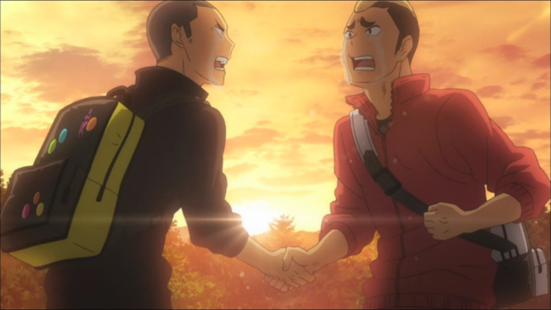 Now that Hinata and Kageyama have won their way into the club and made up with each other, Daichi allows them admission and gives them their jackets. Tanaka grins happily as the first-years line up and then proceeds to teach Hinata and Kageyama how to pose with their uniforms.