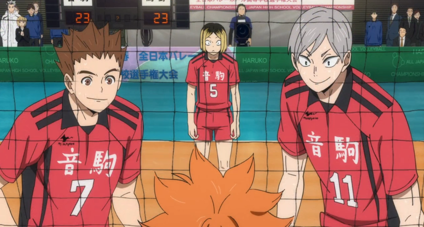 Inuoka would later win Nekoma the first set when being able to block Hinata and Kageyama's quick set for the first time, making him the first person being able to do that. In the first few rallies of the second set, Inuoka continues to effectively block Hinata. After blocking Hinata multiple times throughout the match, Nekoma thinks it would be about time to sub Hinata out for a more experienced blocker. Despite this, Hinata proves that he still wants to play and tells his setter that seeing Inuoka struggling to keep up with him every rally makes him want to continue pushing forward.