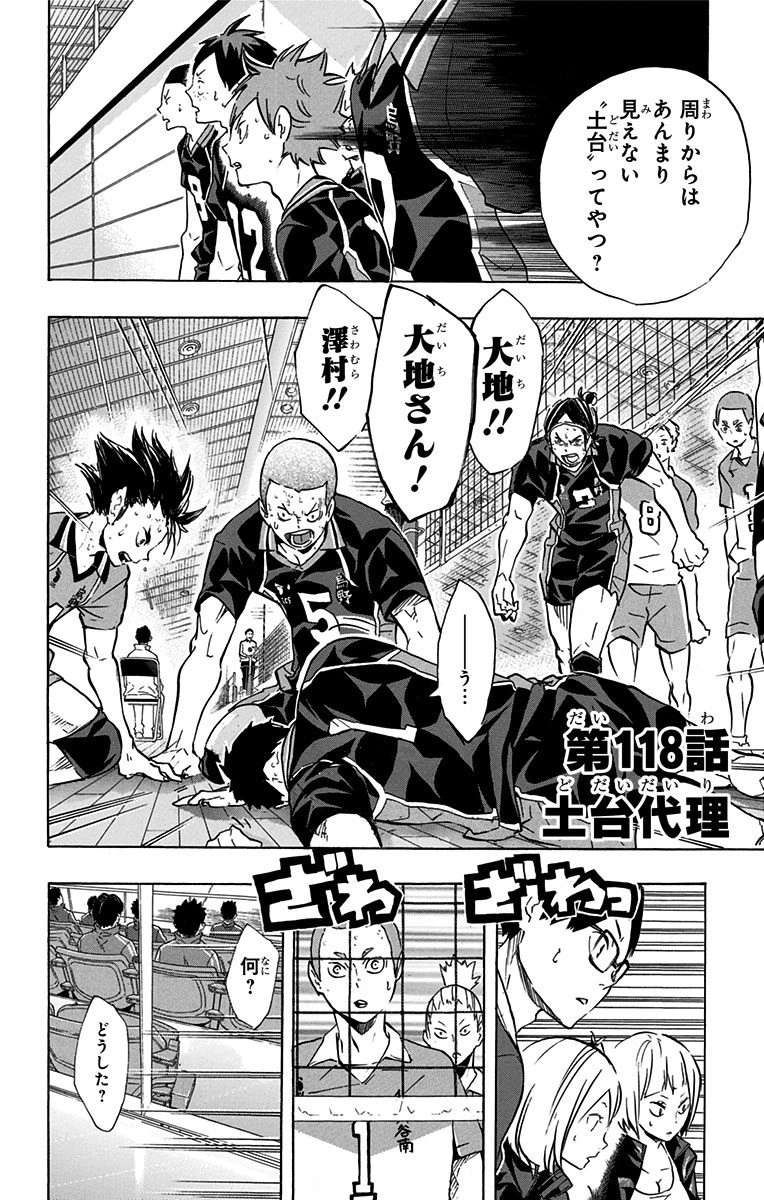 Due to the injury, Oikawa believes that Daichi will possibly be kept out for the rest of the game. Tanaka tries to apologize to Daichi but Daichi instead says it was his own fault, having seen Tanaka attempt to save the last hit but was unable to stop himself until it was too late. From past encounters, Oikawa knows that Tanaka is a player with great mental fortitude but wonders how he will react to the guilt he feels for Daichi being removed from the game. Daichi leaves the team to Asahi before finally being led out of the gym by Ukai.