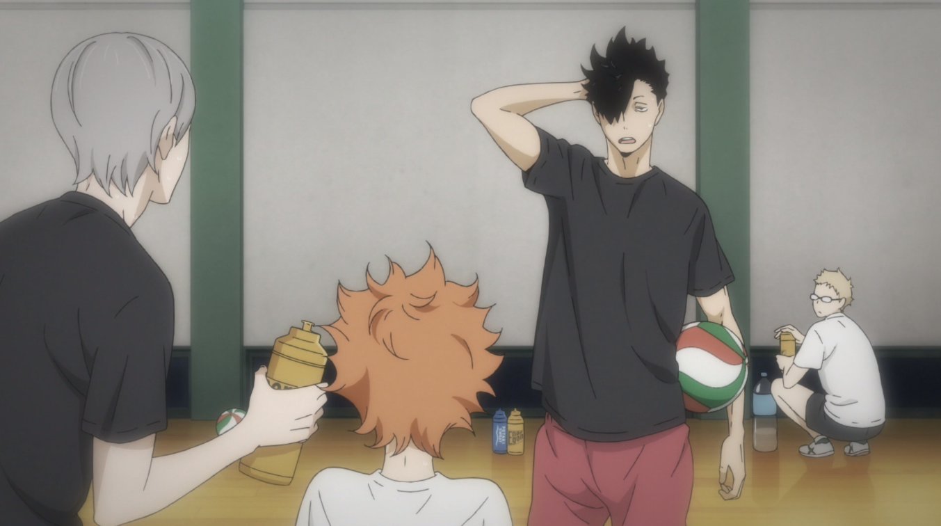 After Kenma is unable to reach Hinata's feint shot, the setter fell to the floor. Kuroo hurried over to check on him only to be surprised when Kenma confessed he was finally having fun in a game. When Lev accidentally bumps into Kenma and knocks him over, Kuroo is shown being surprised at Kenma's sudden change in behavior when he snaps at Lev to keep the ball in play.