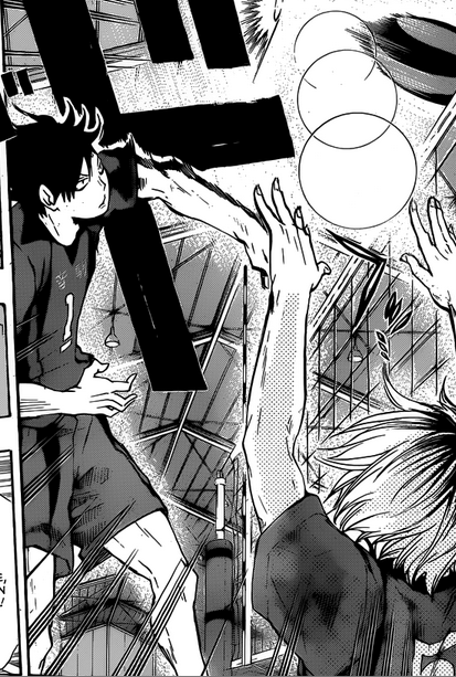 Seeing Lev attempt to beat Kageyama to a ball going over the net, Kuroo knows that the first-year middle blocker doesn't have the technical skills to beat the setter but would be able to use his power and height to his advantage. Kuroo is able to tie the score near the end of the set when he is able to stop Tanaka's spike.