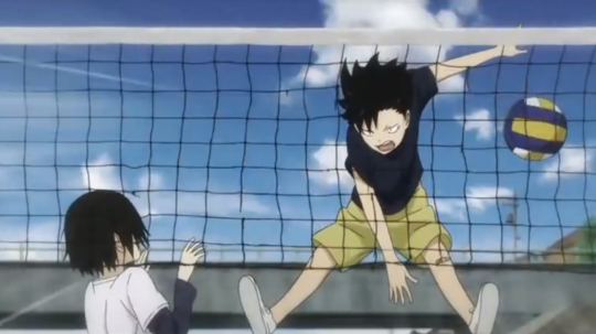 He joined a volleyball team and made new friends at school. Since there were no volleyball players in the neighborhood, Kuroo would still drop by Kenma's house to watch videos of professional volleyball matches together. He would mimic moves he saw, later showing them to Kenma.[5] When he saw Kenma's interest in volleyball tactics, he urged his friend to become a setter, saying it is a perfect position for a strategist and he would not have to move around much.