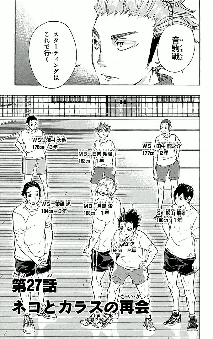 The starting lineup is decided. Ennoshita reveals his and the other second-years' pasts to Hinata and Kageyama. The practice match against Nekoma begins, and Hinata discovers that Kenma is Nekoma's setter.