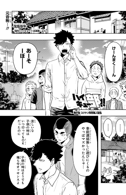 Members of the Nekoma team gather in front of Kenma's home. Kuroo calls out for Kenma to join them but the former setter is nowhere to be seen. Despite Kuroo admitting he would go to Kenma's house all the time when they were younger, Yamamoto comments how showing up at Kenma's house without prior knowledge may not have been a great idea now that they are adults.
