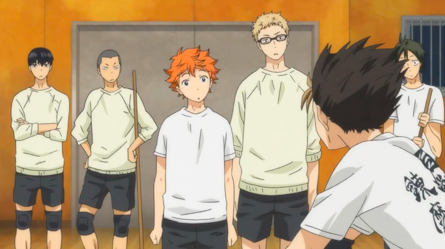 Hinata, amazed and a bit shocked, comments that Nishinoya is shorter than him which annoys the latter. Tanaka tries to calm Nishinoya down. When asked how tall he is, he answers he is 159 cm tall. He scolds Hinata about how being taller is not a big deal to get happy and cry about when Hinata sheds tears of joy upon meeting someone shorter than him since he started club activities.