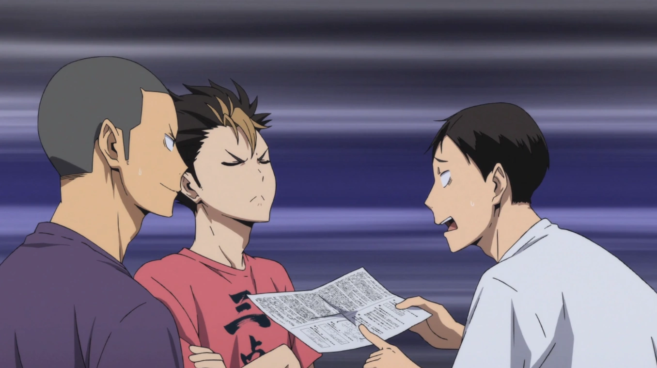 After practice, Nishinoya confronts Asahi and straightforwardly asks him if he doesn't feel sorry for Ennoshita, not to mention Sugawara, who both didn't make it to the starting line up, shocking the two. He adds that, naturally, only the strong can stand on the court, scaring Asahi further. But Ennoshita states that it's not like he's always been dedicated to volleyball, and has even run away from it, too. Nishinoya, however, comments that if he becomes stronger in body and spirit, he can snatch the regular spot from Asahi, fair and square, but his words only rattle Ennoshita. Nishinoya brushes his reaction off and adds as an afterthought that he has to snatch the regular spot from Tanaka first.