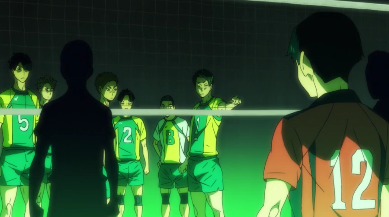 Not far into the match, Inuoka explains to Lev why an underhand pass would be slower. Hearing this, Shibayama concludes the conversation by saying the overhand passes are more controllable. After their own victory, Inuoka and Shibayama are impressed at Inarizaki's cheer squad and Shibayama notices how oppressive they are. Seeing Atsumu's jump floater and before that, his silencing of the crowd, Shibayama, and Inuoka are intimidated. Shibayama also attempts to explain how the ball could go different ways when attempting to receive normally instead of overhanded. Lev claims he understood, but Yaku isn't convinced.