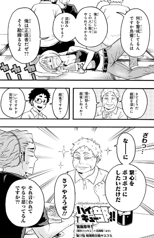 As they get situated to play the game, Nekomata comments how it has been several years since he last played the game which allowed Ukai to feel a sense of confidence as he has played mahjong in college and feels he may have the upper hand. Unfortunately, Nekomata quickly wins five rounds in a row and mocks Ukai by asking if he went easy on the elderly coach. Ukai becomes more irritated when Nekomata reveals that the game is also being used to determine how much each coach is paying for the barbeque on the last day of the camp; Ukai only now finding this out and now having to pay for up to four kilos worth of meat.